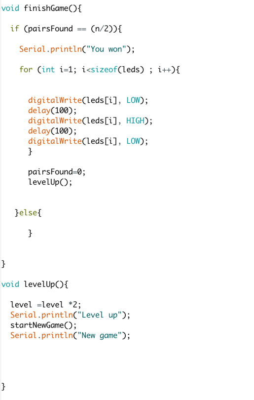 I created a pattern for every pair that included the level as part of the blinking sequence to be able to increase the speed, hence making the game more difficult every time.
