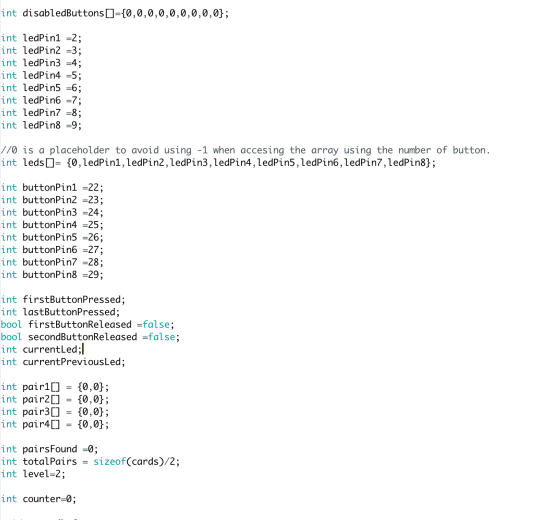 All variables listed here. I end up having to keep track of the buttons and if they were released or not to solve the bugs I had. Also, I had to make sure that once the Led was on because the couple was ok, the button had to be disabled.
