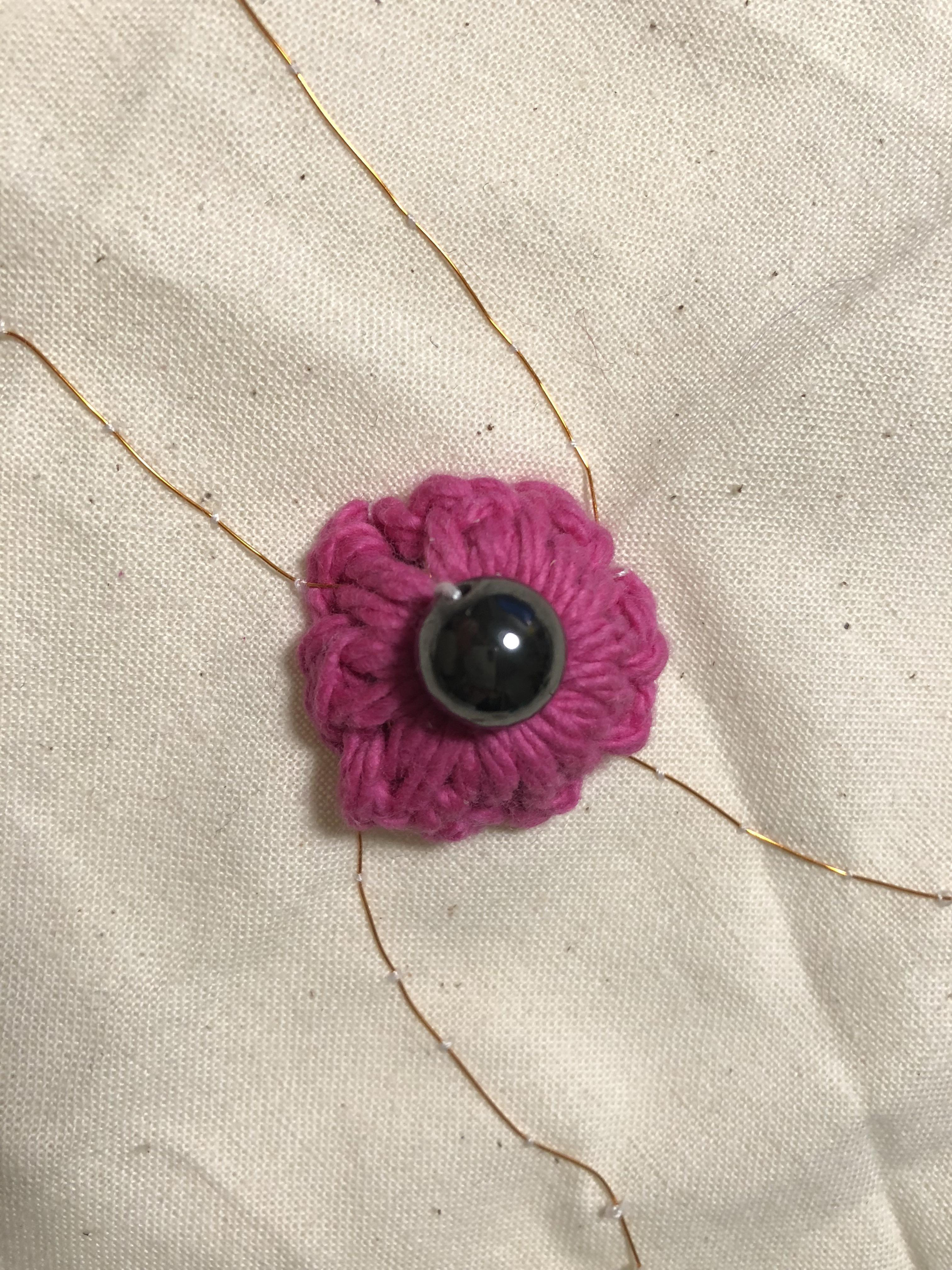 I created a series of flowers with yarn, conductive yarn and conductive thread. The white one, slightly different has a little bit more of experimentation using different stitches and materials ( conductive yarn + conductive thread). I can totally tell which one was the first and which one was the last one!