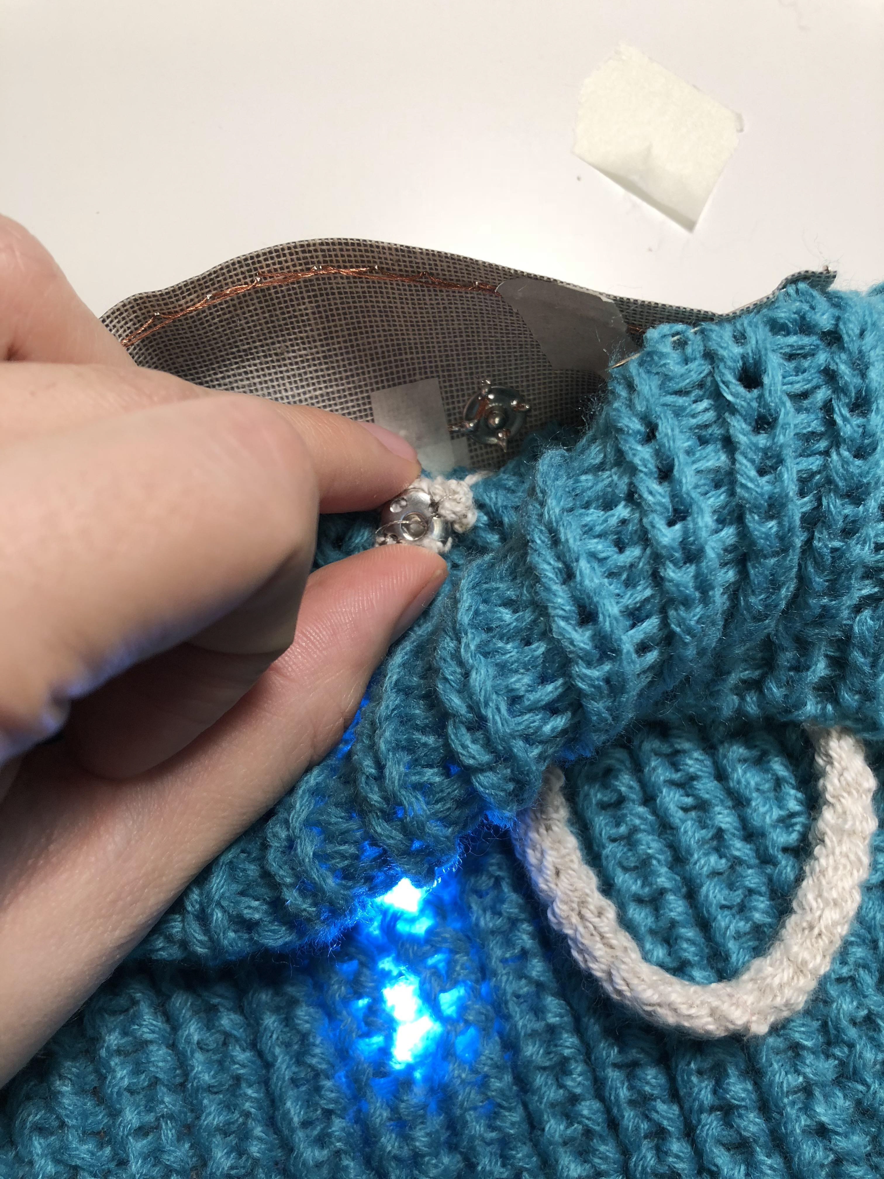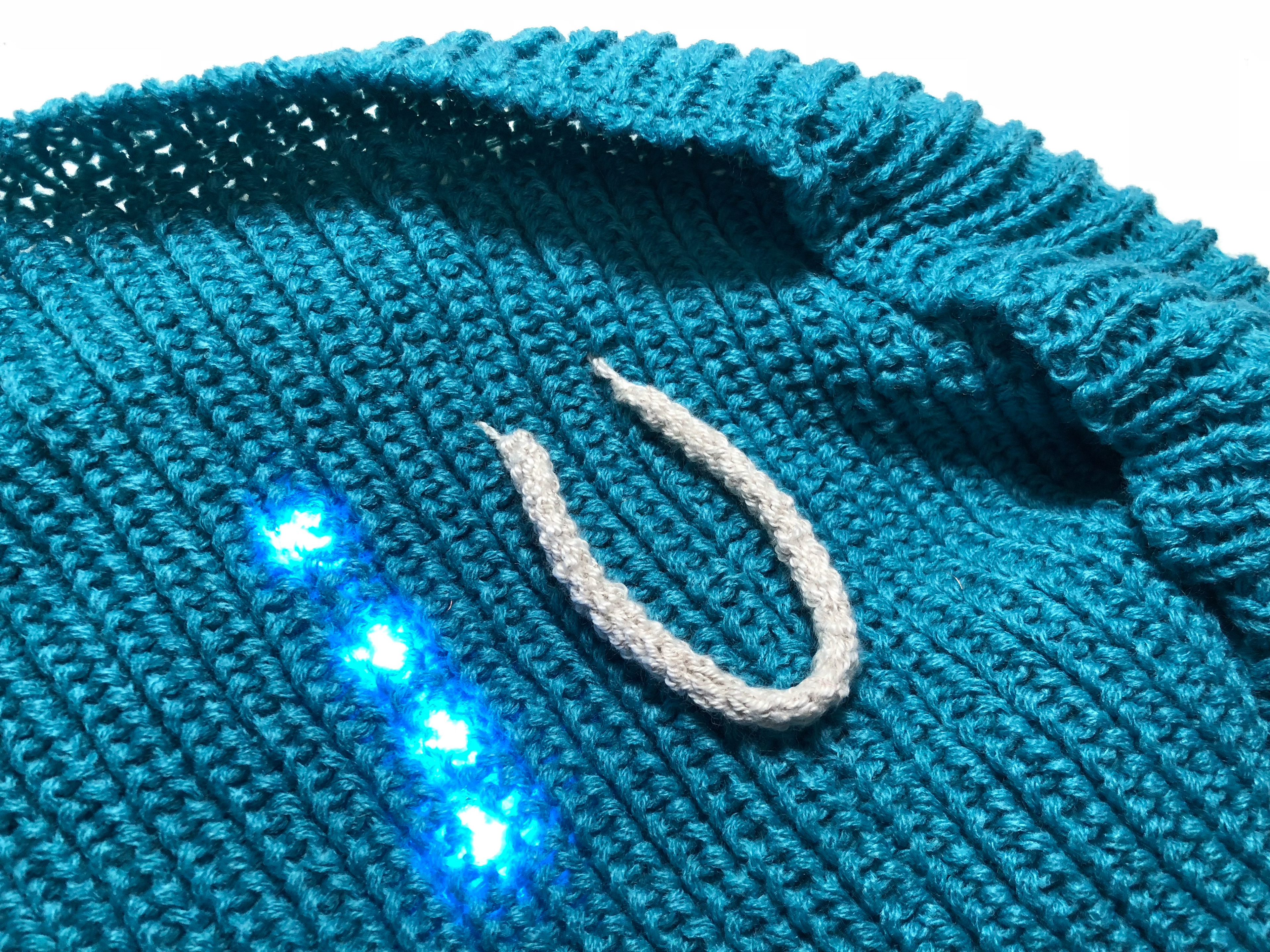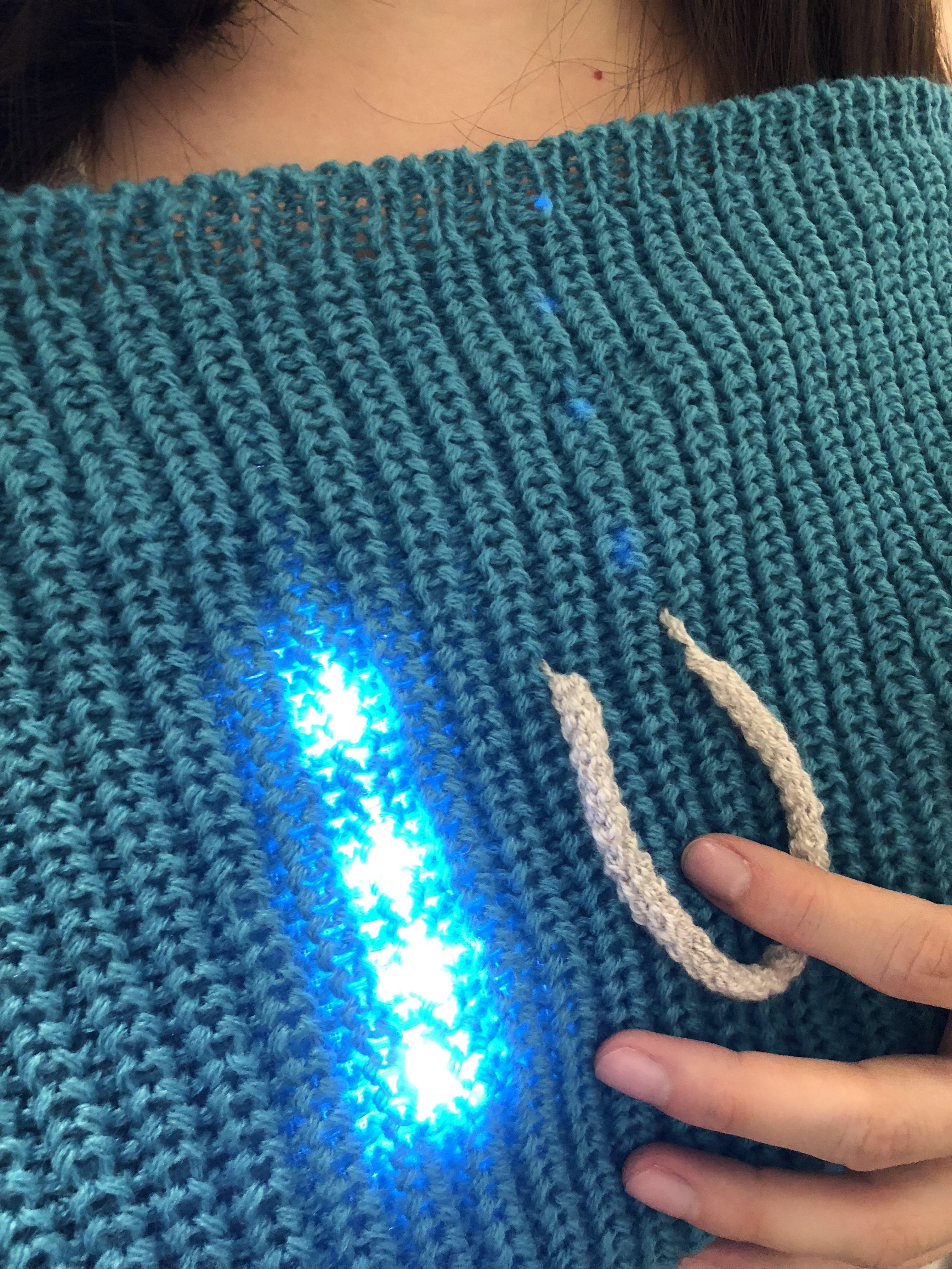 This project comes aims to quantify and visualize the mood, more specifically how eager I am to interact with other people at that precise moment. Ranging from 0 to 4, embedded LEDs show the value on the front of the person’s torso. The user has a stretchy knitted knob that can be used to change the value of the social value just by pulling.