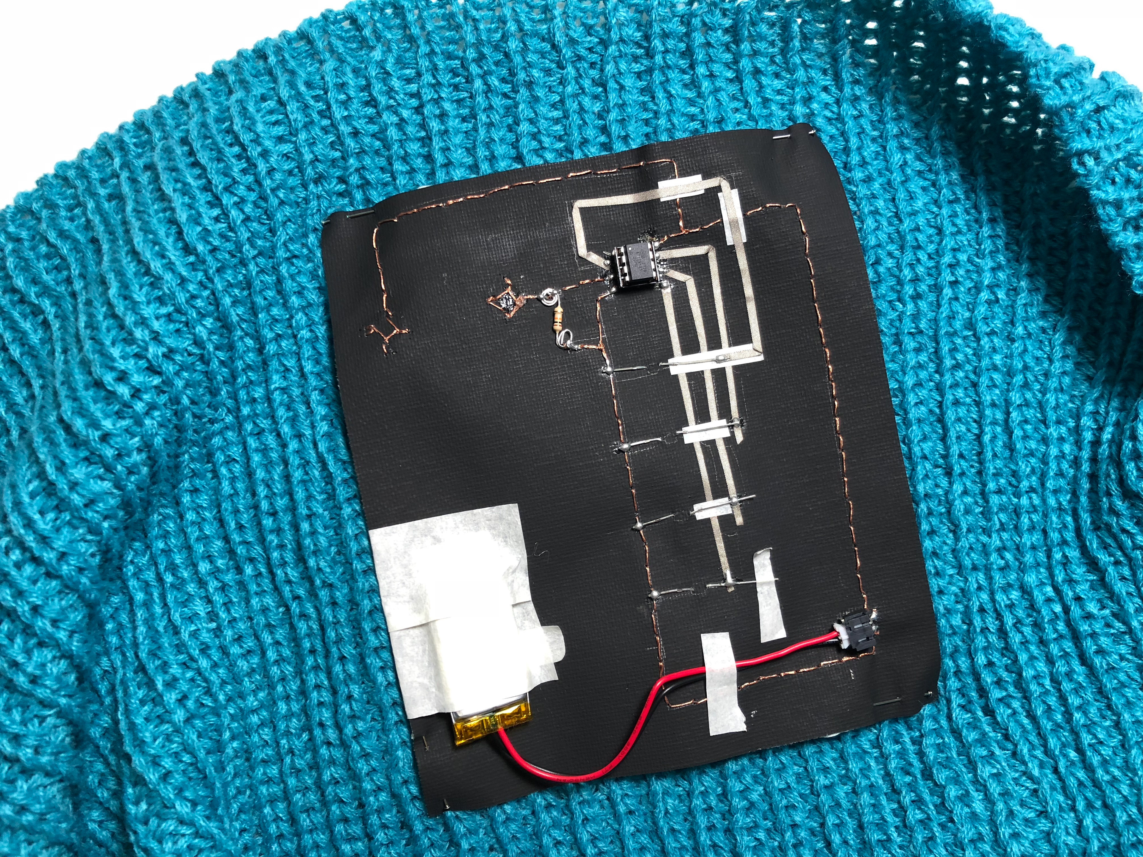 ATtiny 85 + stretchy sensor + 10k resistor + 4x LEDS + LiPo battery + conductive thread